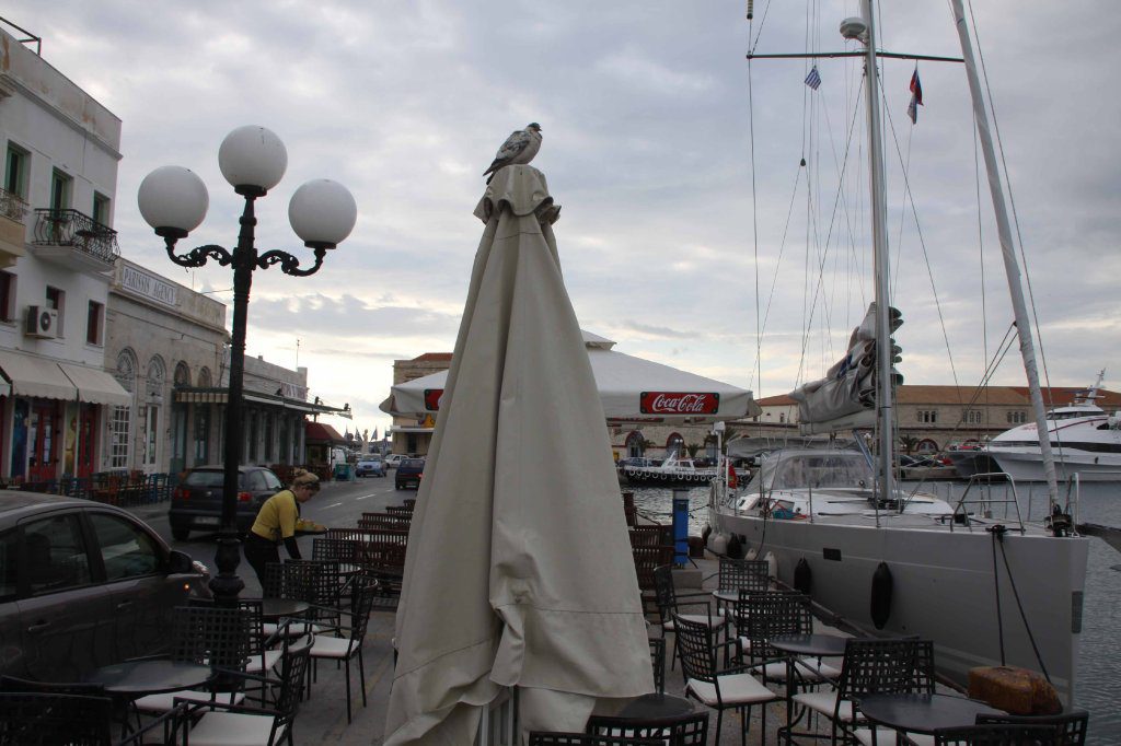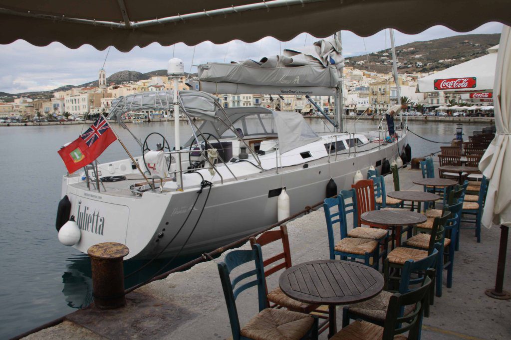 Весь день шли под парусом и на моторе. Мой любимый метеосайт grib.us дал неточный прогноз или я неправильно его прочел? Рассчитывали на бакштаг 20-25 узлов, но просчитались. Подходили к острову Сирос уже в темноте. У берега начало поддувать. Похоже ветер здесь не любит гулять в море, а прячется в складках и долинах островов. На подходе с неохотой начали готовить якорь, не забылась предыдущая швартовка, но, друг, видим огромный порт. Там, где по лоции должна быть марина, находим только причальную стенку с одинокой французской яхтой, стоящей лагом. С огромным облегчением становимся к этой стенке и мы. А принимает наш швартов официант ресторана, к которому мы собственно и пристали.