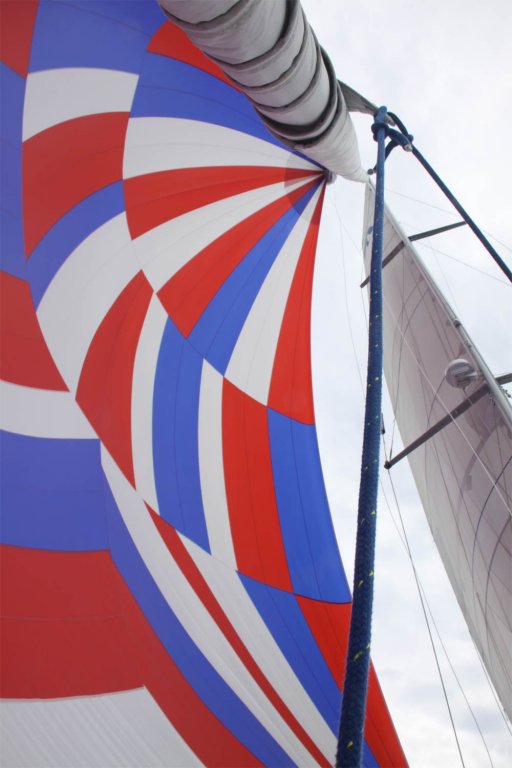 1200, ставили новый генакер, большой и красивый. «Джульетта» чуть из воды не выпрыгнула от удивления и удовольствия! Сто восемьдесят квадратных метров. Есть рукав, поэтому легко ставится вдвоем: один на баке работает, другой в кокпите за веревки дергает.