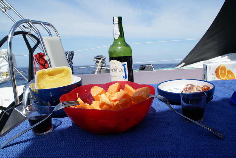 Завтрак посреди Бискайского залива прост и изыскан: бутылка Мадеры, свежая папайя из супермаркета Ла Каруньи, немного хамона из Порту, алтайский мед (папа недавно привозил), сыр и вчерашний хлеб.