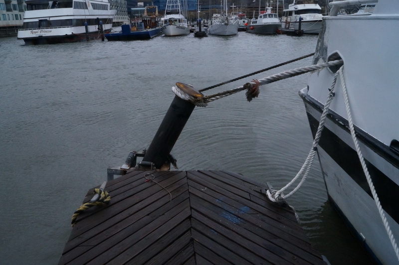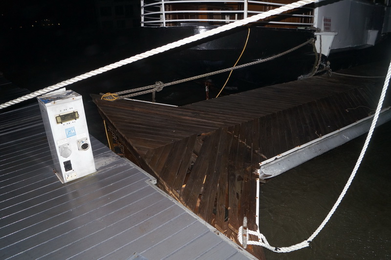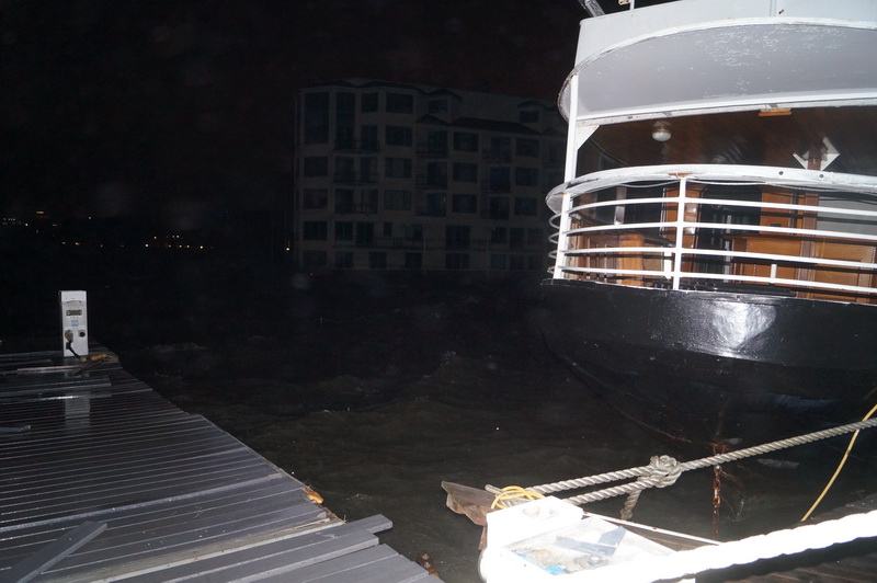 2035, сорвало понтон справа от нас. Точнее сорвало его хвостовую часть прикрепленную к столбу. Теперь он свободно гуляет из стороны в сторону. Сорвало также следующий понтон и еще один за ним. Между этими понтонами стоит большой катер который теперь привязан только носовыми швартовыми. Дальше еще один катер или, правильнее сказать пароход, его развернуло боком, понтон вверх-тормашками. Беда в том, что ветер продолжает заходить к юго-востоку и все эти понтоны начинает валить на нас. Наш понтон уже поехал влево, один из шарниров крепления коренной части сломан.