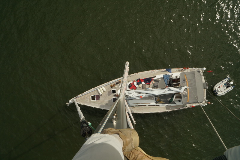 Пару дней назад, Алексей Васильев попросил помочь ему поставить мачту. Приехал на своей желтой лодке со товарищи. Все русские, все живут здесь. Леша работает в Норд Сайл. Завели наш спинакер-гик как стрелу крана и за час управились.