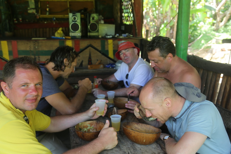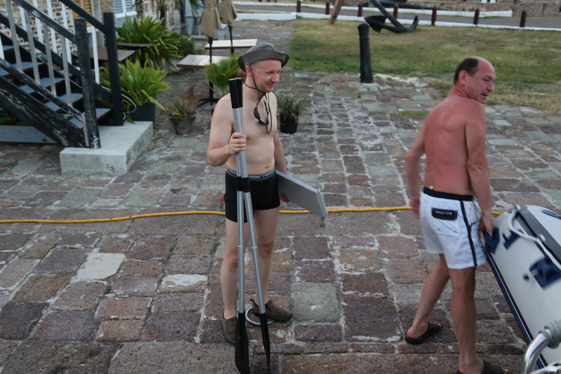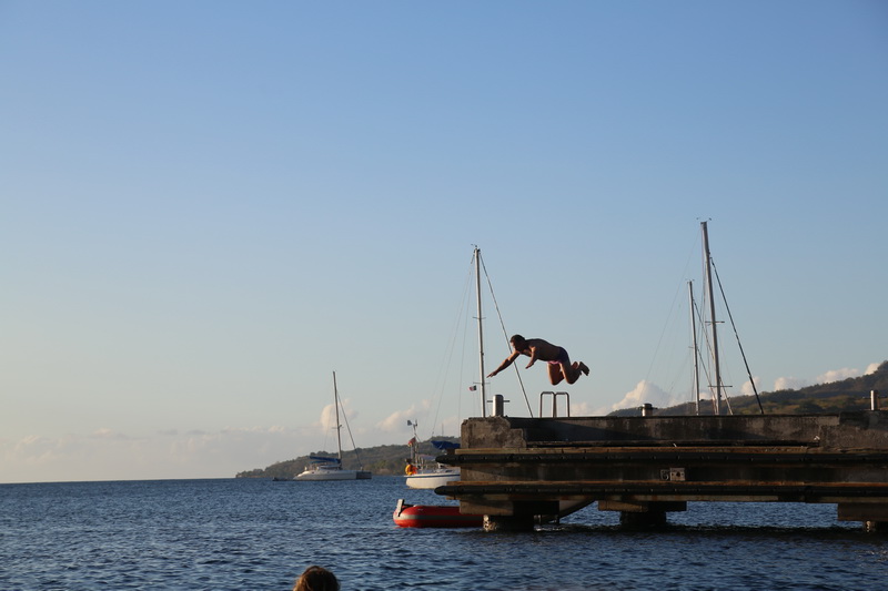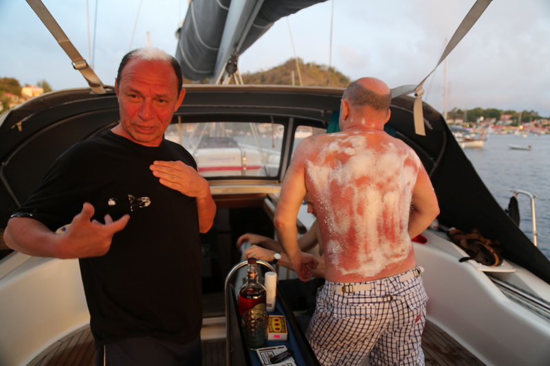 В конце дня заправились водой у Джерома. Делается это так: Нужно встать на муринг у красно-белого буя в юго-западной части бухты и вызвать по 73 каналу месье Джерома. Поднять из воды шланг, который привязан к мурингу, и идет  по самому дну к дому Джерома. Вставить в горловину бака пресной воды. Джером поворачивает вентиль и вот уже свежая вода льется к нам в бак. Единственное неудобство этой схемы – то, что после заправки, чтобы расплатиться, вам придется ехать на тузике на берег. Здесь на пляж выходит высокая волна и можно запросто замочить штаны.