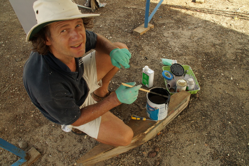 Весь день красил днище «необрастающей» краской. «Родной», белой краски не хватило, в магазине смогли купить только черную, теперь у «Джульетты» днище черно белое, как у касатки или костюмчик арлекино? Во всяком случае, посмотрим, какая краска лучше.