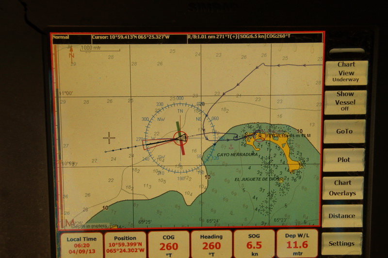 1750, встали на якорь за совсем небольшим островком с интригующем название Herradura, координаты 10*59.5N 65*23.2W. Рядом очень красивый пляж, маяк, пара хибар на берегу и два «рыбака» на якорях. Ветер до пяти балов, но мы неплохо укрыты, во всяком случаке, лучше чем прошлой ночью. Неприятная новость – картплотер наш Simrad не бьет, ночью по нему заходить нельзя. А вот Ipad молодец, бьет. Спасибо Ильясу за подарок!