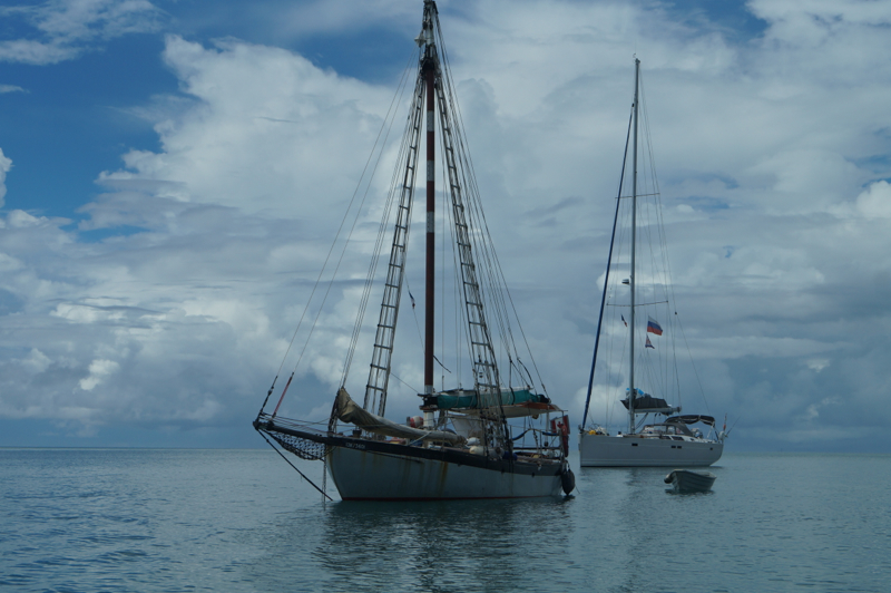 Лодка стоит на якоре и ждет запчастей из Европы. Дождь поливает каждый день, заправляет наши баки водой из облака, а солнце заряжает наши аккумуляторы. На стоянке мы не одни. Рядом лодка пожилой пары из Канады. Скоро возвращаются домой.