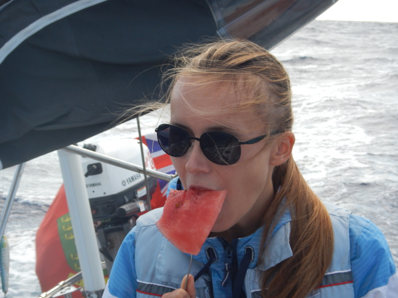 1410, ветер усилился до 17 узлов, зарифили грот Время перекусить арбузом..
