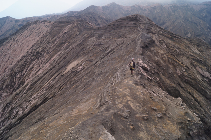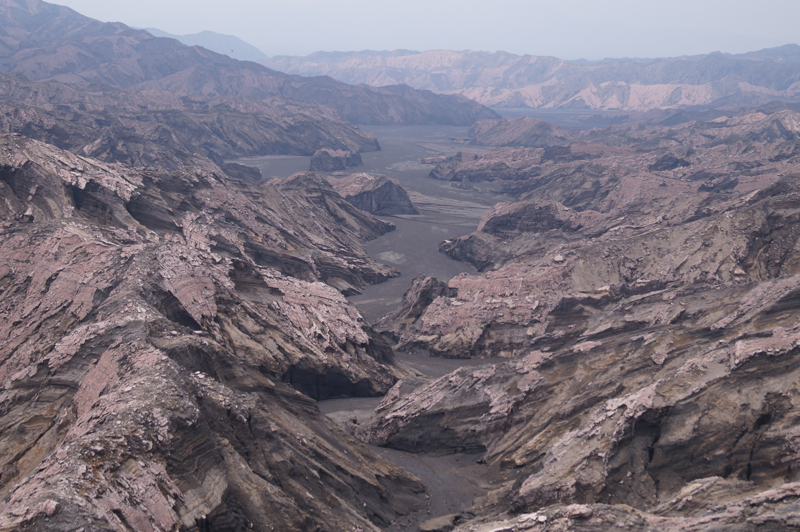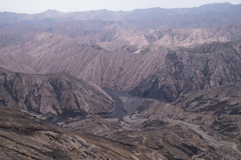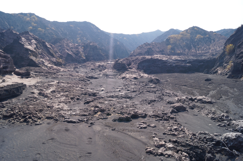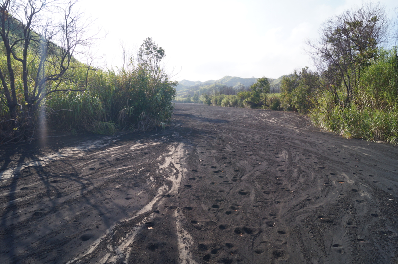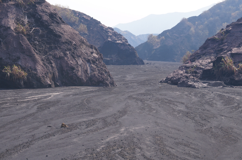 Идти к вулкану, действительно не близко: быстрым шагом четыре часа по песку и камням. Дорога идет по руслу рек, которые высыхают, когда нет дождей. Эти реки стекают с вулкана и несут с собой вулканический песок и шлак. Вода ушла, а песочная река осталась, как будто застыла. Машина привезла нас к тому месту, где песчаные реки встречаются с джунглями, дальше нужно идти пешком. Подъем, особенно вначале, почти не чувствуется. Песок лежит плотно и нога не «буксует». Идти легко. Постепенно джунгли вокруг сменяются заросшими холмами, потом зелени становится все меньше и уже через два часа ты идешь среди живописных горных хребтов. От надоевшей стопроцентной влаги и зелени не осталось и следа. Воздух сухой, вокруг только горы и горы, как будто попал на другую планету. Рядом с подножием вулкана нужно из долины одной реки перейти в другую долину. Тропа идет через миниатюрный перевал, какое-то время по хребту, а потом снова спускается к песчаному потоку.