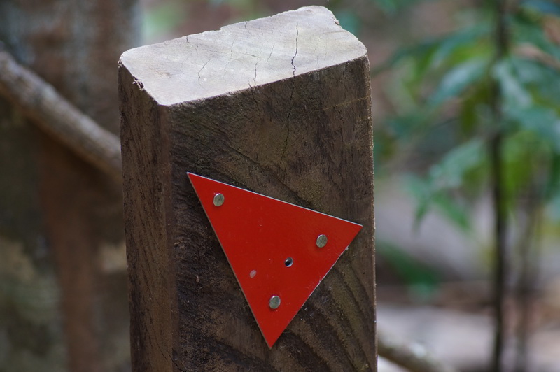 Кто-то, кто проектировал эту тропу, сильно любит нашего Малевича. Указатели в виде красных треугольников — загляденье. А как приятно, было рабочему прибивать их к столбикам, искать правильный угол наклона, который будет соответствовать повороту тропинки. Вбить один гвоздь, отойти на пару шагов, прищуриться, оценить композицию и вбить второй гвоздь…