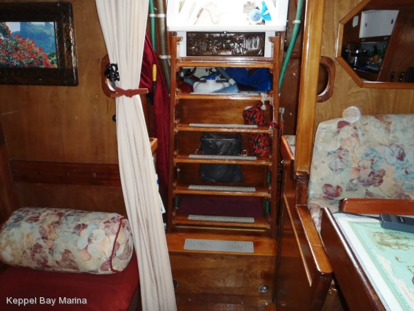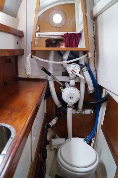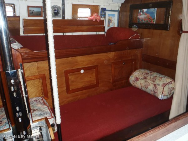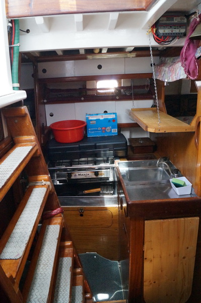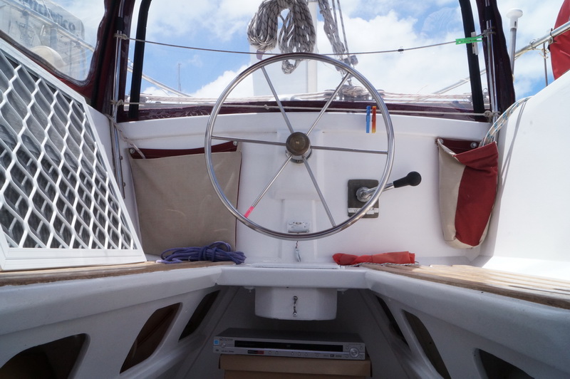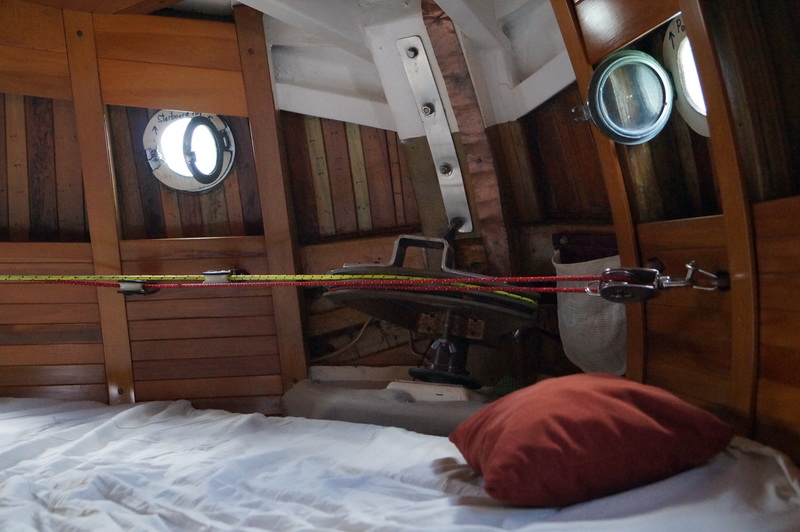 Есть передняя каюта, кают-компания и кормовая каюта. Самая большая койка в кормовой каюте, но меня смутило, что рулевое управление выведено прямо в жилое помещение. Очень удобно ремонтировать и все время на виду, но вот одеяло в блоки не попадет во время качки?