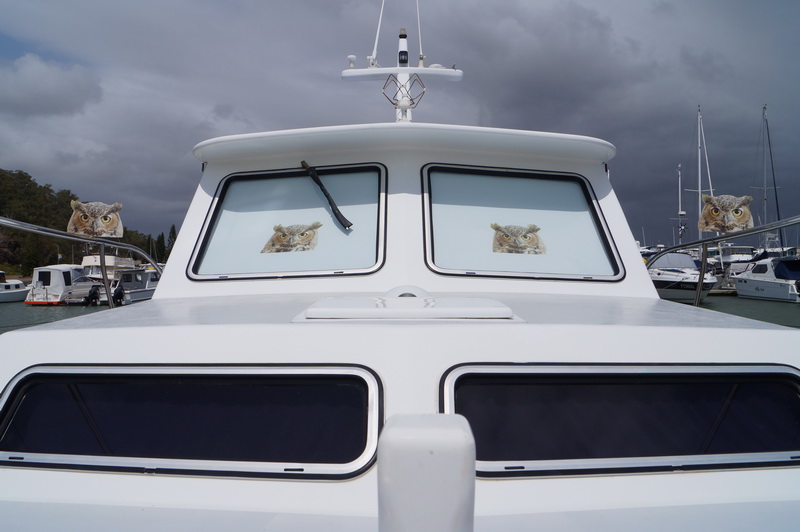 В марине на лодке вот такие картинки для отпугивания птиц. Неужели, работает? Те головы, что на ограждениях, крутятся, но все же…