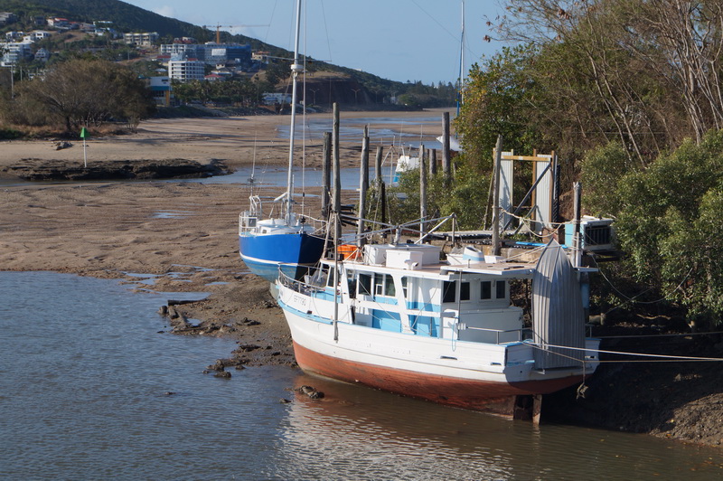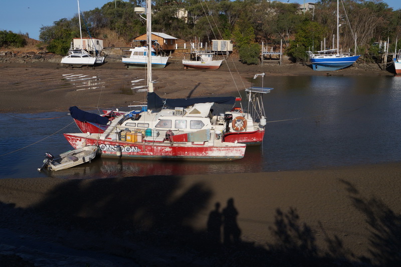 В этой части побережья довольно большие приливы: до пяти метров. Местные лодки часто оказываются на земле — всегда любопытное зрелище. Стоянка в устье реки Карравал.