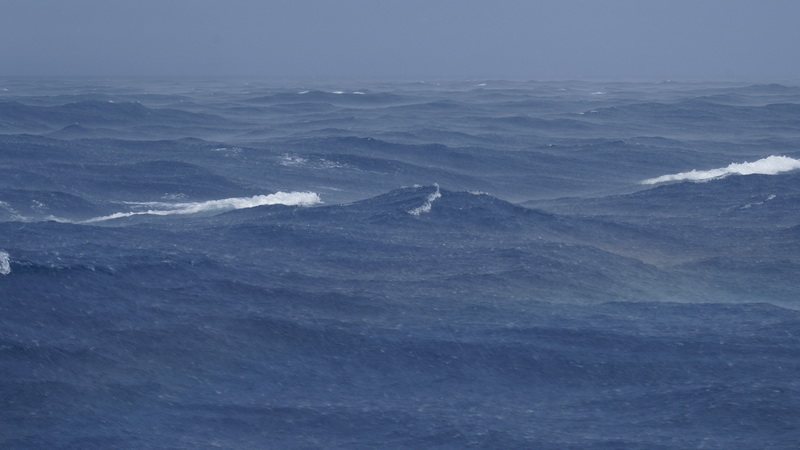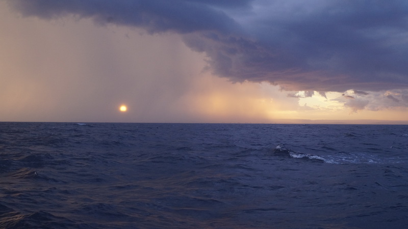 1330, справа с континента подходят грозовые тучи. Ветер 16-18 узлов, северный. Начинает сильно качать. Потихоньку оторвались от «Осириса II».