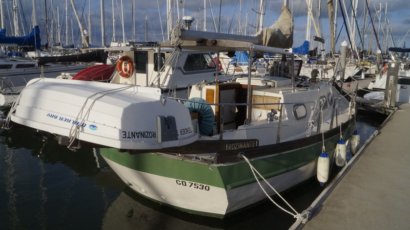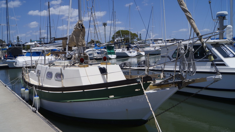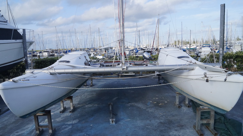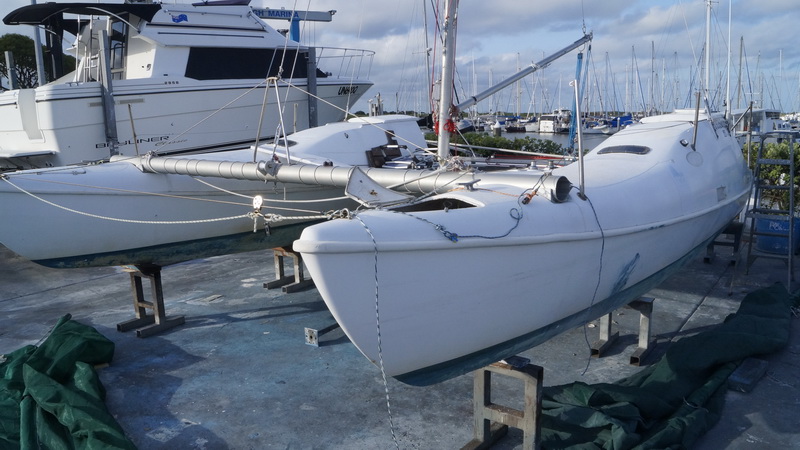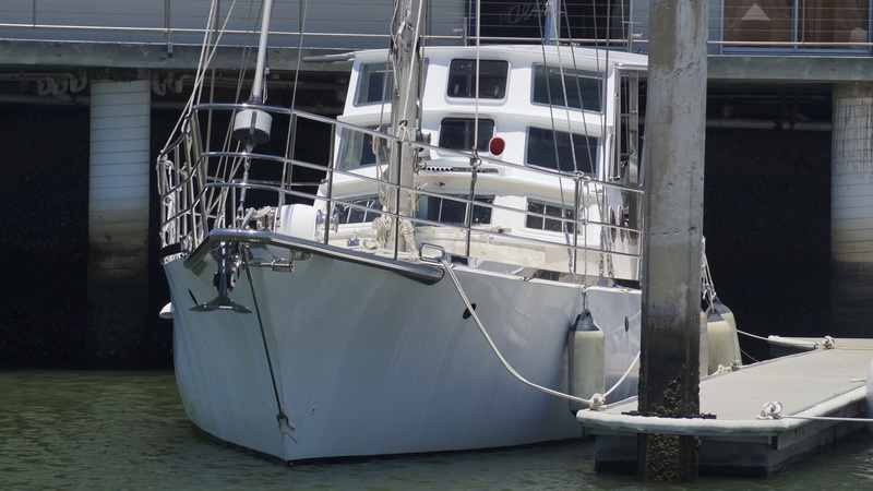 Еще одна лодка рядом с офисом марины. Катамаран «Поворотная точка» (Turning Poin). Хороший такой, легкий, катамармнчик на два спальных места, напоминающий ботинки из мутфильма про гусей и голландского мальчика с чубом. Никогда на таких не ходил, наверняка в определенных условиях это — очень удобная обувь для прогулок под парусом.