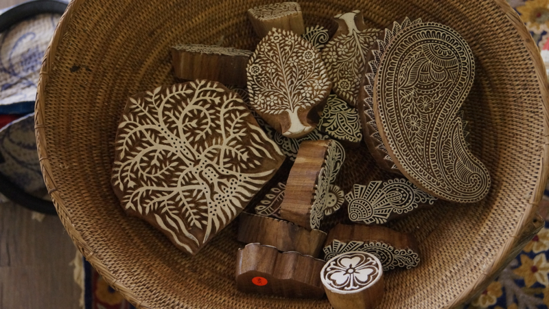 Там же, в магазине, деревянные набойки для нанесения узора на ткани.