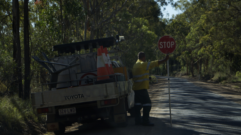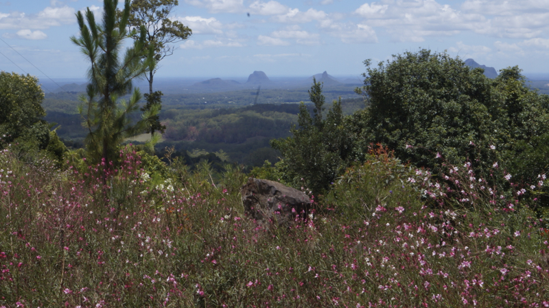 Рядом с дорогой низменность, а на горизонте «стеклянные» горы, Glass House Mountains.