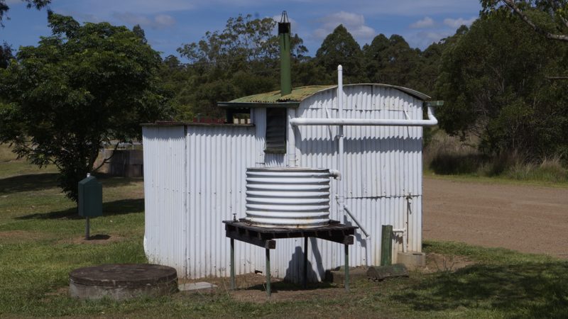 Есть аккуратный беленый туалет. В туалете стоит обычный унитаз со смывом водой. Вода дождевая, стекает с крыши вот в этот бак. Никаких чудес. Дизайн восьмидесятых годов.