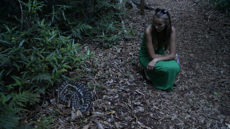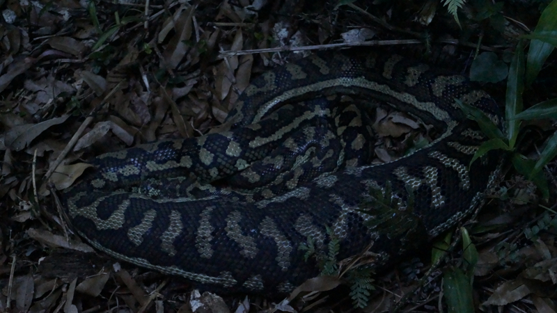Уже в сумереках не утерпели и решили пойти по тропинке. Встретили вот этого удава или питона, не знаю, как правильно. Видимо, он как раз проглотил кролика. Приятного аппетита!