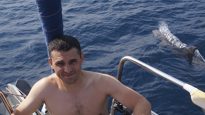 0700, прибегали дельфины. Маленькие, с сизовым оттенком, и рассказали, что у нас сломан узел крепления амортизатора гик-оттяжки к мачте. «Ни дня без песни», как говорится. Позавчера полетела каретка шкота генуи, теперь вот гик-оттяжка…