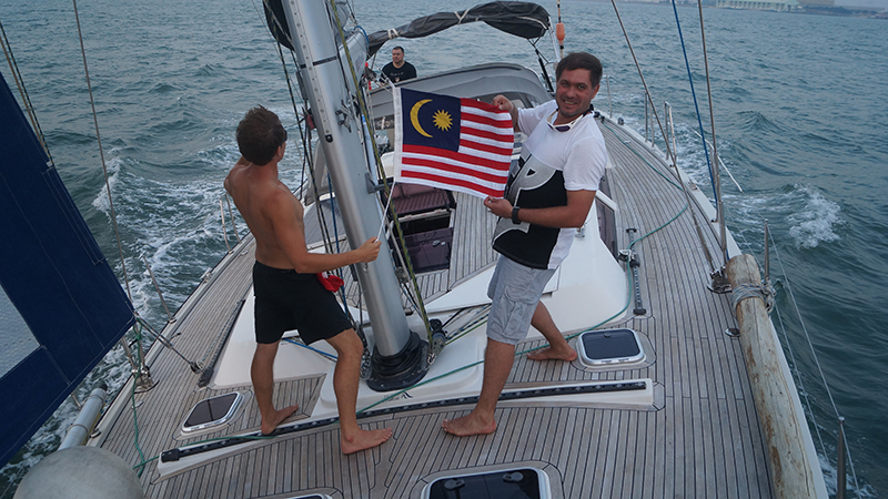 1810, встали под паруса. Лавируемся вниз по Каналу славы. Ветер до 14 узлов. Сняли флаг Сингапура. Подняли флаг Малазии. Сегодня у нас ночной переход в порт Диксон.