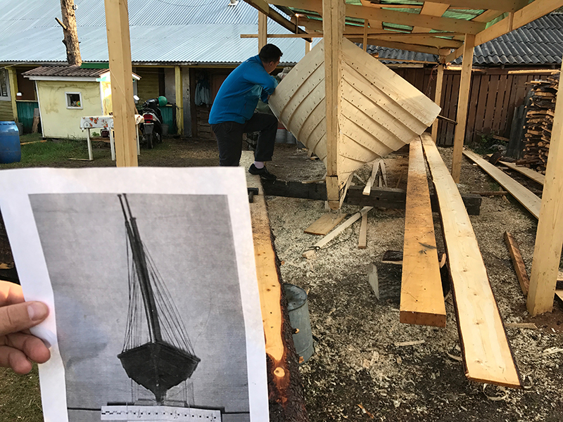 ВП ходит вокруг карбаса с рулеткой и фотографией музейной модели.