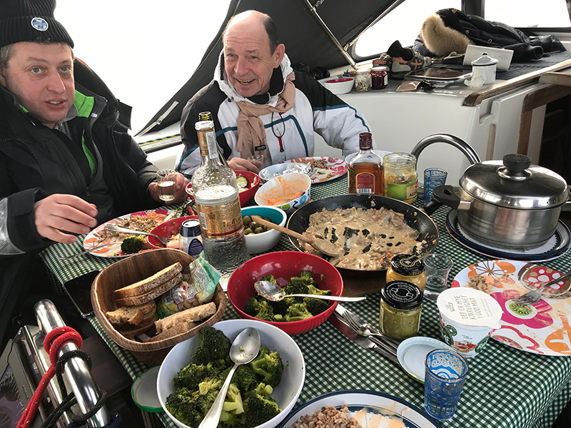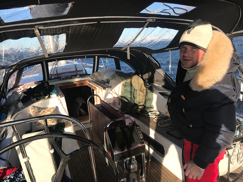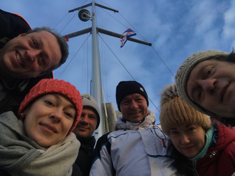 Команда на борту опытная. Где мы только не были вместе — и на Канарах, и на Кубе, и в Марокко, и в Новой Зеландии, и на Белом море. Поэтому при отходе от причала в 0840 забыли отдать швартов. После веселой беготни по лодке и пирсу, смогли оторвать замерзшую как бревно веревку от понтона. Предыдущие, которые не забыли, отливали горячей водой из чайника. А эта была припорошена снегом.