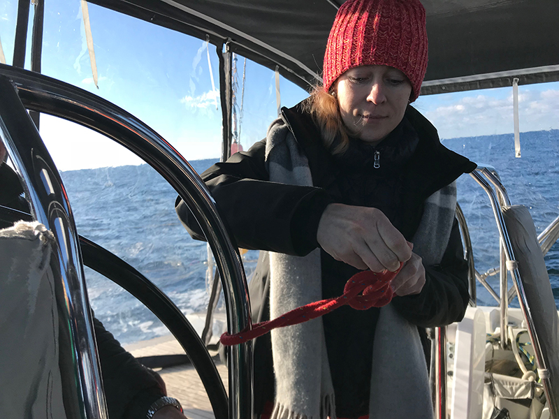 Аня Тарасова за рулем. Ведет как по линейке. Смотрю на картплоттер. Вижу скорось 9,7 узла. Браво.