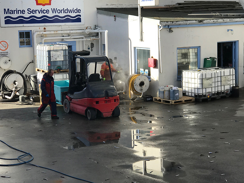 Попросил экипаж помочь заправиться водой. Нашли её на заправке больших судов. Воду нам дали, правда для этого пришлось оттаивать шланг специальной установкой с горячей водой.