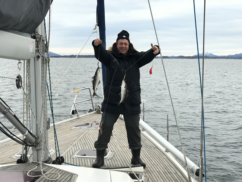 1230, пробовали рыбачить — пока безрезультатно. Выходим из фьорда Хардангерфьорд. Время от времени порывы попутного ветра провоцируют поднять паруса, но тут же стихают. Прохладно.
