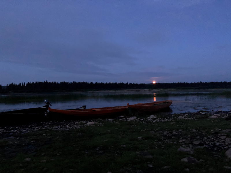 2230, лагерь стоит. Луна зажглась огромным фонарём и разлилась дорожкой по Мезени. Очень красиво. Мы сидим и пытаемся разобраться в отличиях галсового угла паруса от шкаторины. Наконец-то отпускает мандраж сборов и дорожная суета. Ничего не забыли, всё теперь идёт своим чередом.