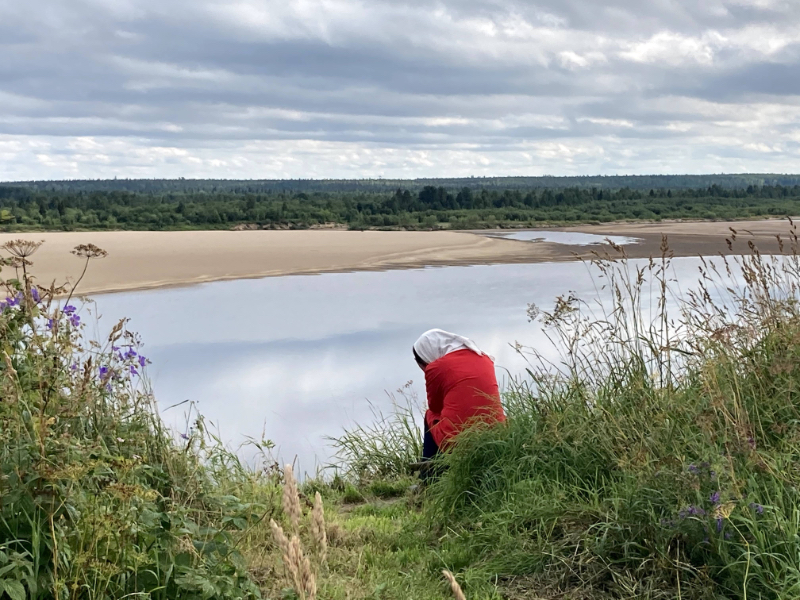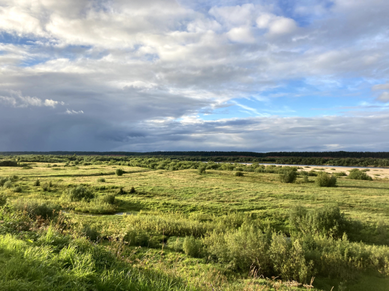 1500, пересекли Мезень. С переправы под Кимжей, которая должна стать нашей конечной точкой, открылся вид на реку, испещрённую отмелями и песчаными косами. Видимо, периодически будем садиться на мель. Впрочем, об этом меня предупреждали.