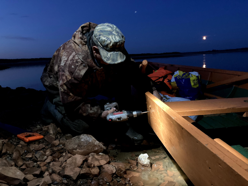 2130, к переправе на скутере прикатил Виктор Петрович Кузнецов, чтобы помочь нам починить выпадающую банку. Виктора Петровича здесь знают все. Он известный мастер — шьёт карбасы, зырянки, вот и наши лодочки сшил тоже он, так что банку нам починил по гарантии)).
