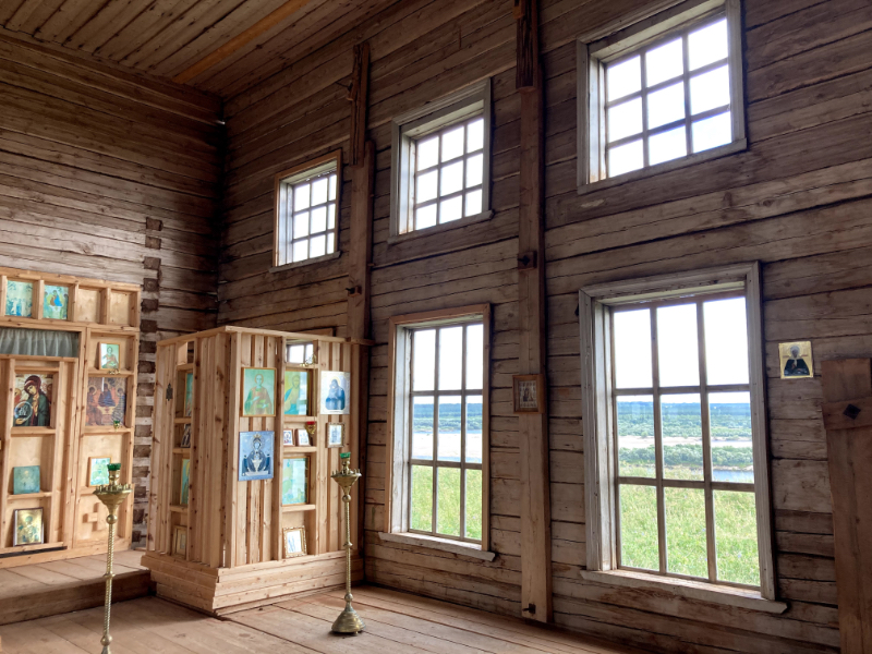 1400, пообедав, мы отправились осматривать местные достопримечательности под предводительством Галины Ивановны. Зашли в церковь, которая была построена в конце 19 века, а в советское время служила зернохранилищем. В 2000-ых жители села очистили внутренние помещения от остатков госплана и собрали иконы, у кого что было; получился эклектичный иконостас. Только резному архаичному распятью не нашлось места, батюшка забраковал, и теперь оно стоит на площадке колокольни.