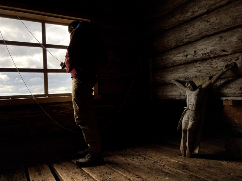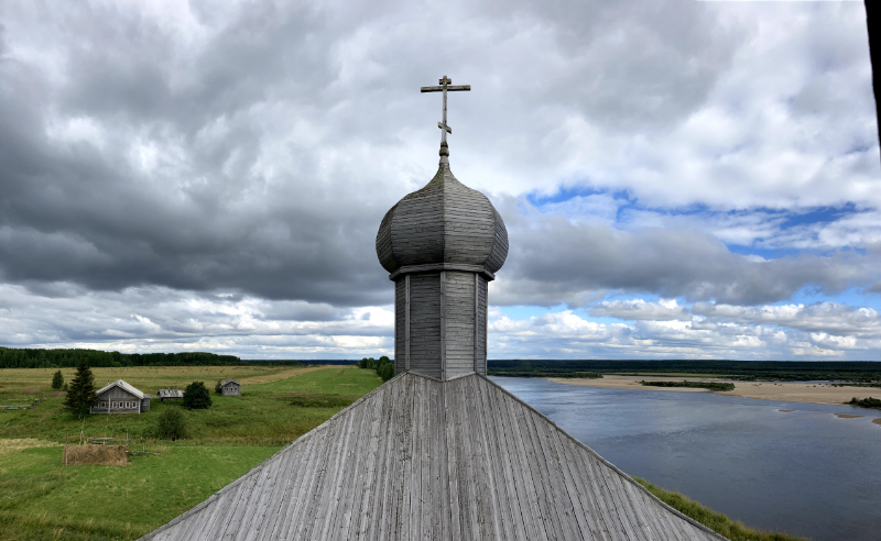 Поднявшись на колокольню вместе с Алексеем Николаевичем Морозовым, который живёт здесь же и который как раз занимался реставрацией церкви, я сажусь опершись на колонну и отключаю внимание. Не так часто удаётся ощутить полное спокойствие и я пользуюсь моментом. Алексей Николаевич рассказывает Наташе о жизни в Кельчемгоре — о колхозе, о судьбе церкви; выхватываю из их разговора редкие фразы.