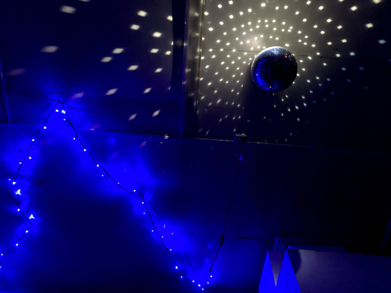 2200 Обследовав главную комнату клуба, выясняем, что у нас есть всё, чтобы устроить рейв — диско-шар, стробоскопы, ультрафиолетовая лампа, кислотно-синие гирлянды. Включаем всё это и деревенский ДК превращается в странный зачарованный уголок в бесконечном пустом пространстве, а мы становимся странниками не только в пространстве и времени, а ещё и между реальностями. С такими необычными мыслями засыпаю на полу клуба-церкви где-то на Руси.