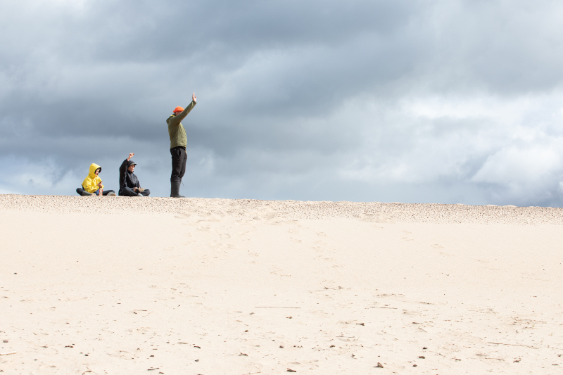 1330, обед. Да в каком месте! Проходя очередную песчаную кошку, мы замечаем, что характер берегового пейзажа начал меняться: камней стало меньше и появился песок. Дно, кстати, теперь тоже не представляет опасности, оно песчаное с пятнами гальки. И вот мы видим крутой песчаный скат берега. Белый песок пляжа манит к себе и мы сдаёмся, преодолевая сносящее нас течение, пристаём к bounty island. Атмосфера тропического пейзажа захватывает, и мы, поддавшись искушению, прыгаем в холодные воды Мезени. После купания, поднявшись на песчаную дюну, мы оказываемся в австралийском буше, образованном кустами ивняка, растущего там и тут среди песка. Пейзаж, который по нашим представлениям свойственен исключительно тропическим широтам, на деле оказывается типично северным (такой же вид я встречал на пляжах по берегам Северной Двины). Пообедали и снова в путь.