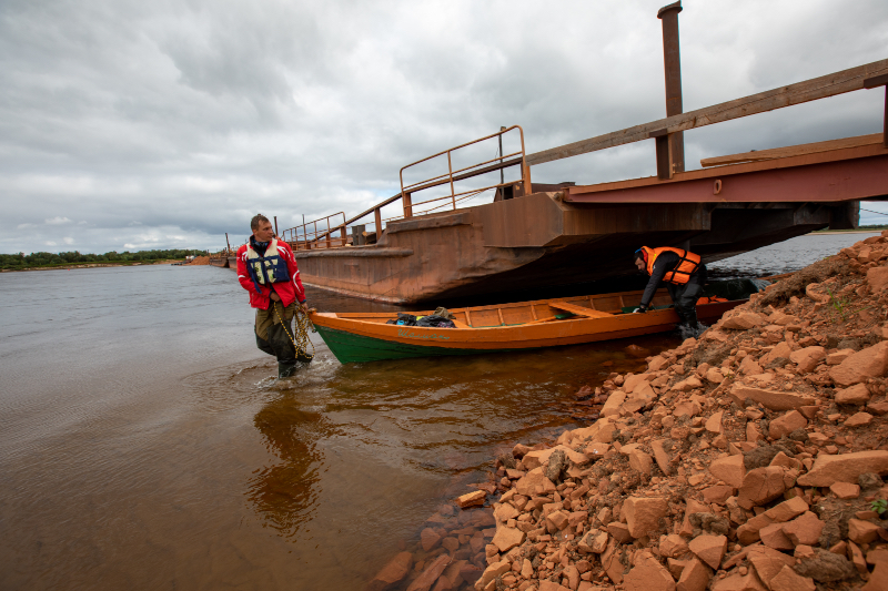 1330, на переправе. Подходя к ней, я внимательно осматриваю возможные пути прохода и обнаруживаю, что под левым берегом есть прекрасное место под автомобильным мостиком, где можно перевести лодки вручную. Так и поступаем — встаём за 30 метров до прохода, оставляем в лодках только вещи, приязываем к корме и носу по концу и проводим по одной лодке за раз. У берега вода спокойная, но под пантон уходит сильная струя течения, способная перевернуть лодку, поэтому с кормы при проходе страхуют двое.