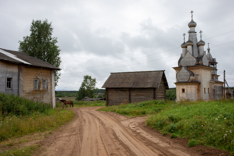 1240, пришли в Заручей. Это одна из пяти деревень, раньше объединённых в одну большую Кельчемгору. Мы зашли сюда посмотреть на пятиглавую деревянную церковь, отреставрированную силами жителей. Дорога к ней пролегает через две деревни и сказочной красоты луг, проходя по которому мы замолкаем и я, закрыв глаза вхожу в состояние динамической медитации.
