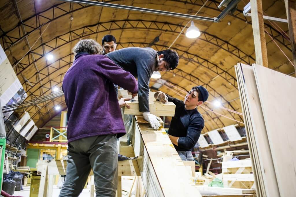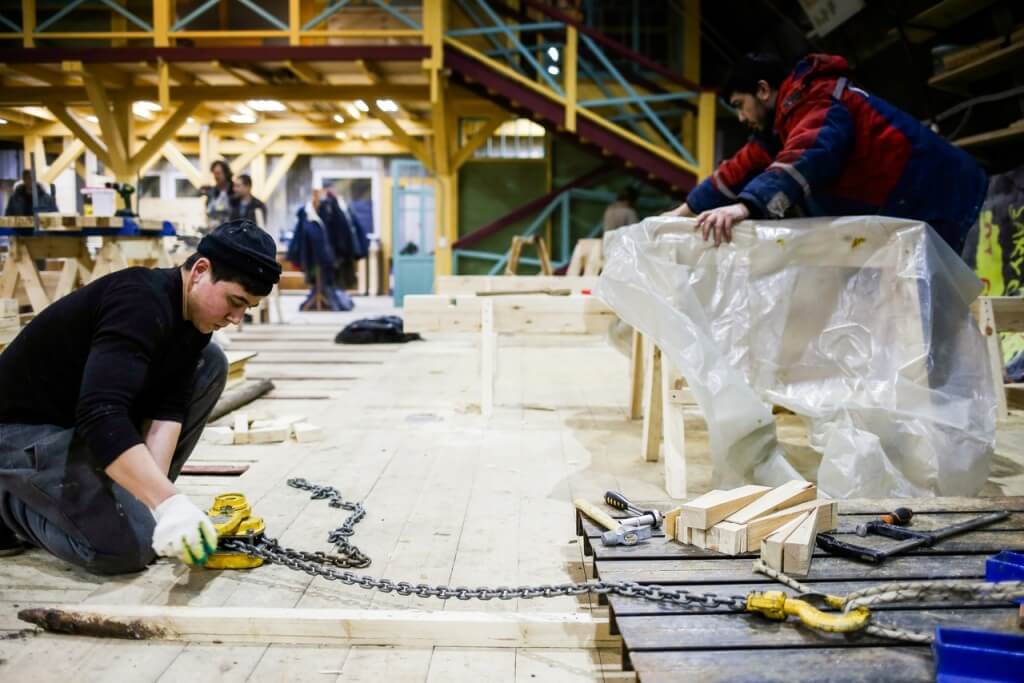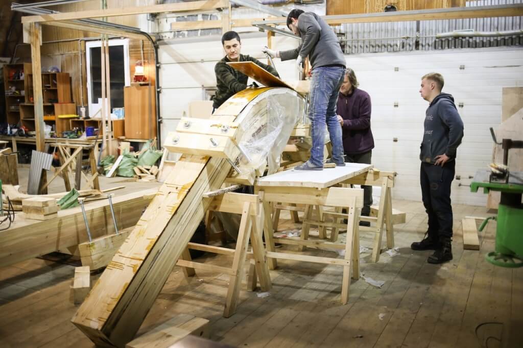20 января. В среду Виктор Петрович подстрогал киль и штевни карбаса в одной плоскости и с помощью цепной электропилы выбрал по всему килю шпунт – углубление, куда входит обшивочная доска. Ее прихватили медными гвоздями, а затем при помощи рычагов завалили и подтянули к штевням. Таким обзразом, доска в середине киля лежит горизонтально, а к штевням изгибается и становится вертикальной. Чтобы доски не ломались при скручивании, накануне мастер запарил доски в кипятке и оставил на ночь завернутыми в полиэтилен. Интересный момент: чтобы доска приобрела необходимую форму, Виктор Петрович прикрутил две кобылки поперек киля. В классической школе для этого делают шаблон, а на Мезени, откуда родом Виктор Петрович, практикуют особую технологию «рассольского шитья». Эта технология названа по имени мастера Рассолова. Рассоловское шитье требует от мастера хорошего глазомера. Также в этот день, используя соединение «в ус», нарастили доски до длины 7 метров. Кроме того, на верфи начали снаряжать столярную мастерскую и продолжили строить дополнительные стенки для выставки наверху. Миша Крупенин начал делать шаблон бакса для шхуны, а Александр Антонов продолжил работу по написанию гранта.