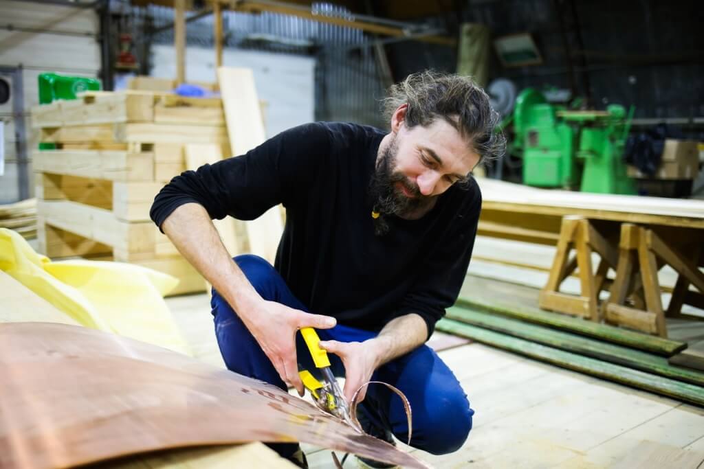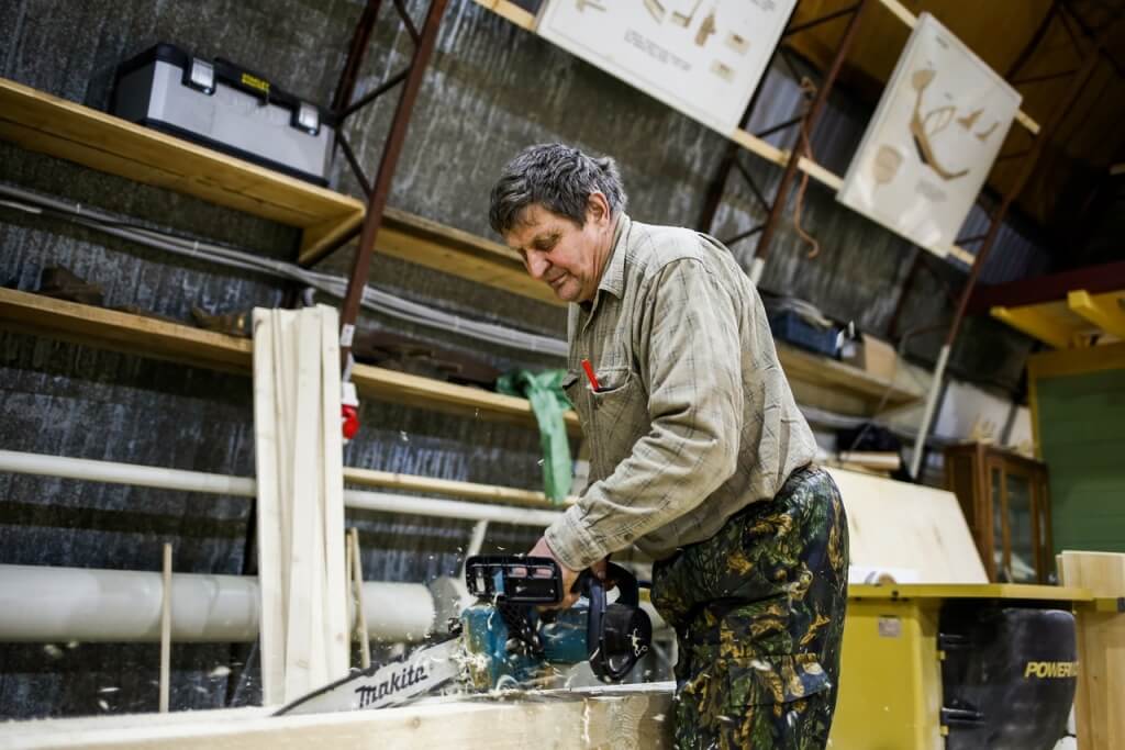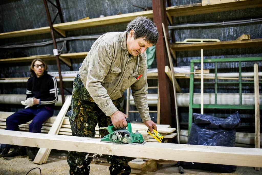 21 января. Накануне выяснилось, что карбас нужно переделывать — заказчики не согласились с клееным форштевнем и попросили использовать исключительно кокоры. Пришлось Виктору Петровичу отправляться домой в Лешуконье за новыми кокорами. Благо, десяток-другой кокор в его сарайчике всегда есть. Посидев за столом, подумав и посовещавшись, решили для себя, что вся эта история – во благо. Переделывать начатый карбас не станем, заложим новый, а старый останется на верфи в качестве учебного пособия. Тем временем, в ожидании возвращения Виктора Петровича участники мастер-классов начали делать клещи для фиксации набоев при пошивке карбаса. Миша закончил делать шаблон для бакса – части киля, которая соединяет непосредственно киль с форштевнем. К вечеру мастера доклеили сам бакс для шхуны. Заказали шесть брусьев для постройки флота карбасной регаты.