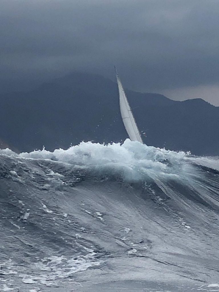 1010, встали под паруса. Ветер до 35 узлов, крутит, бросает лодки на борт. Лавируемся в море.