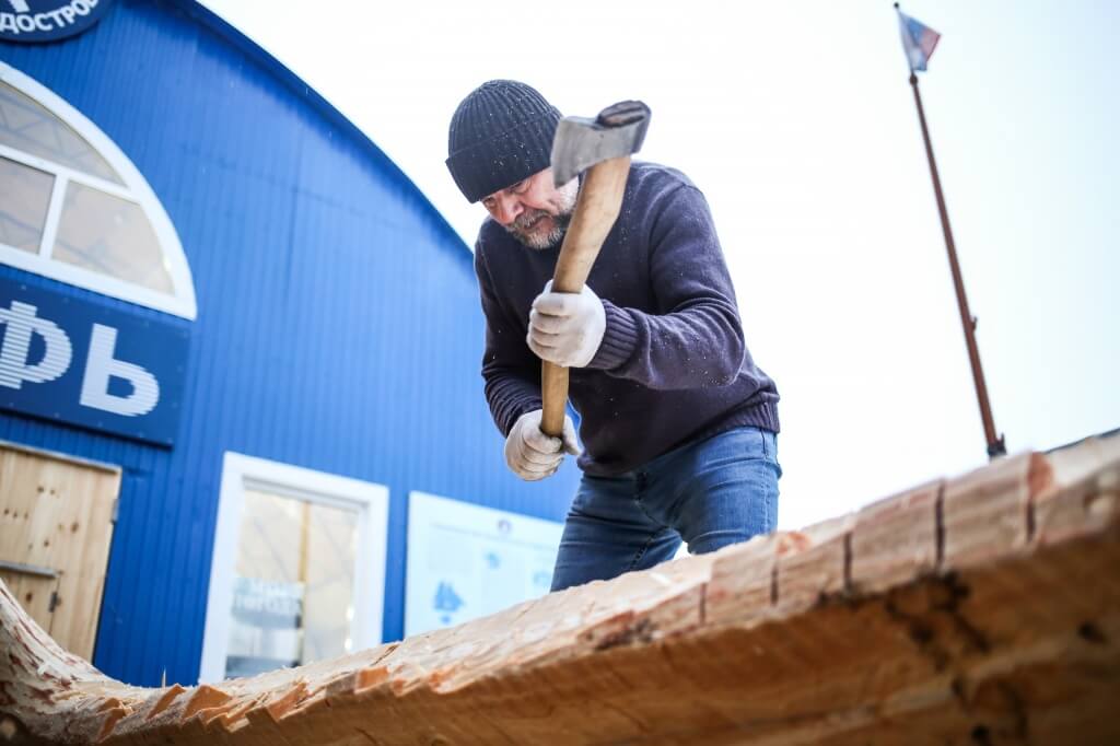 Саша Антонов окорил и обтесал новую кокору с четырех сторон для копии малого карбаса из Лопшеньги.