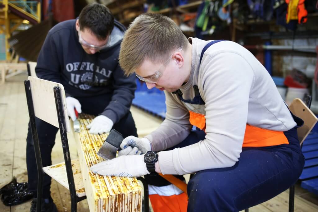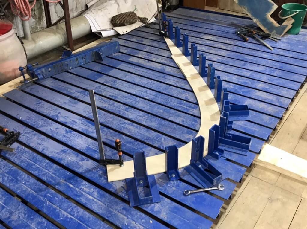 Ребята с Дашей клеили штевни для регатного карбаса: сделали шаблон, установили упоры, приготовили ламели (тонкие доски), промазали их эпоксидной смолой и склеили.