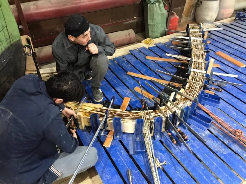 иша делает соединение киля и штевней. Буквально завтра мы начнем клеить заготовки штевней.