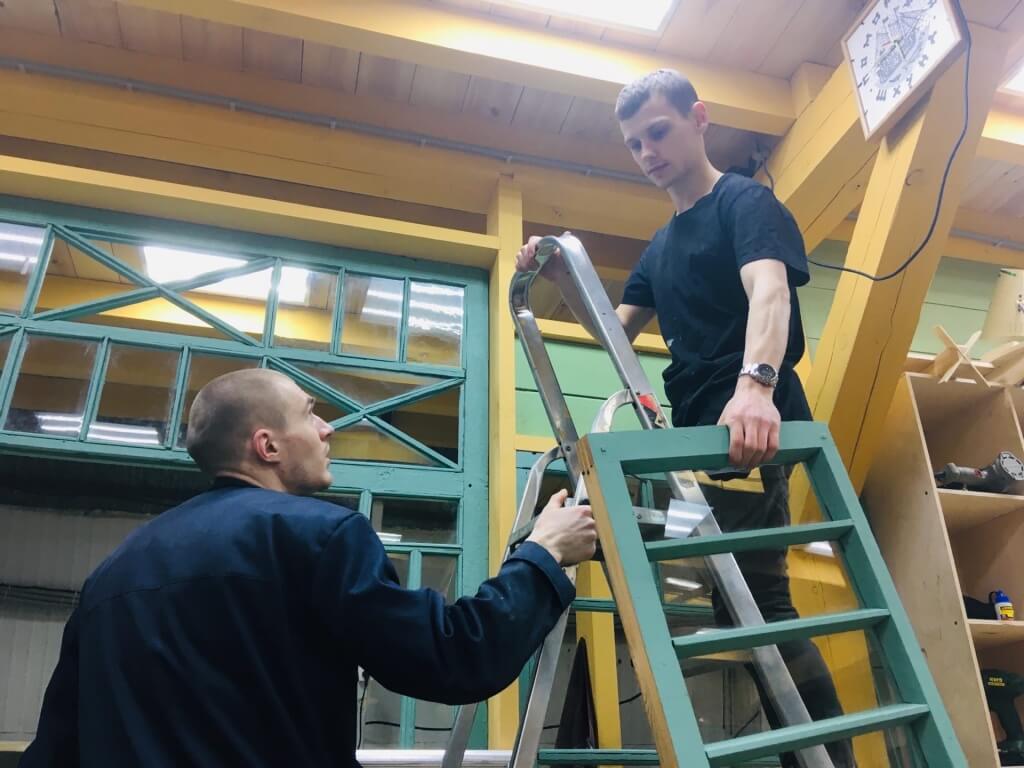 Ребята заканчивают ставить на верфи распашные ворота вместо подъемных. Новые ворота сделали давно, но из-за морозов никак не могли их поменять, а теперь пользуемся потеплением.