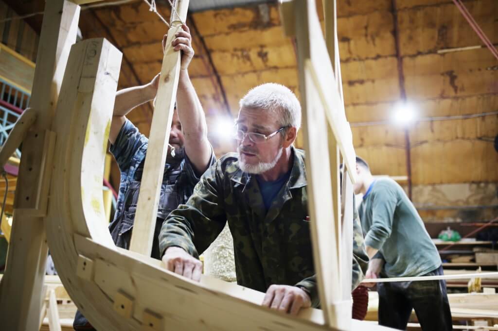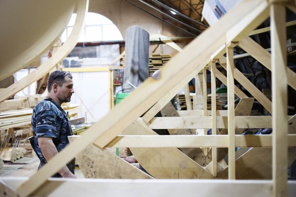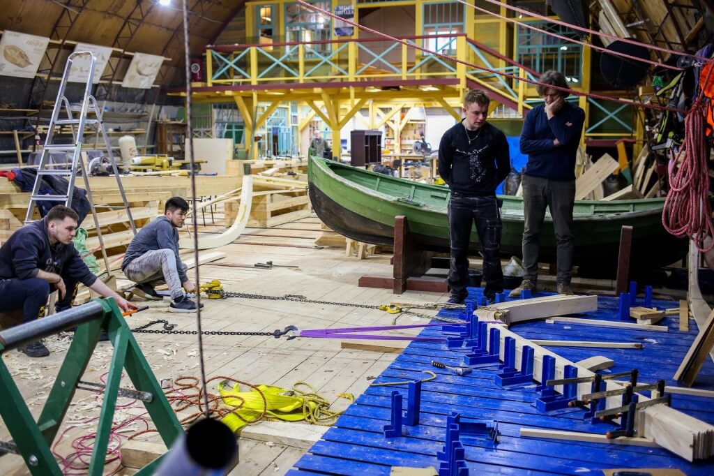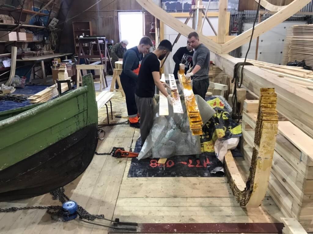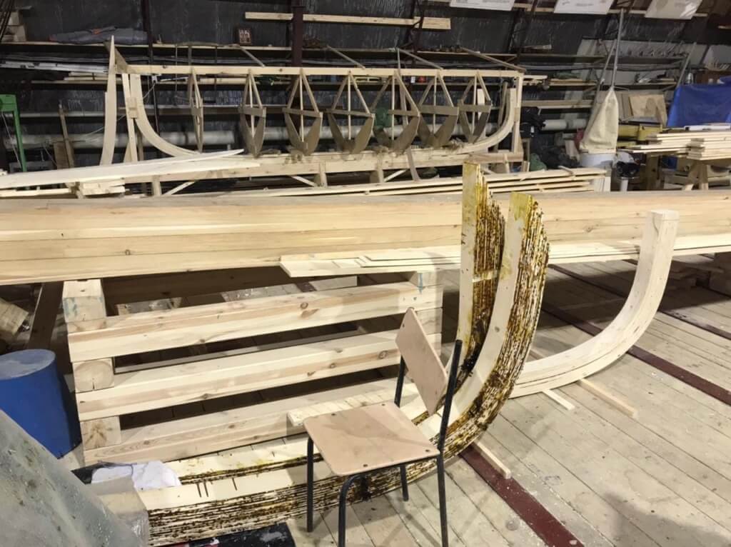 1 апреля. Артём устанавливает первый набой обшивки регатного карбаса. Он идёт долго, потому что это и первый набой, и первый карбас в жизни Артёма. Доски обшивки прижимают рычагами и клещами, проклеивают силиконовым герметиком и закрепляют саморезами. Завтра, когда набой схватится, саморезы заменят на гвозди. Это делается для надежности — Артём говорит, что не доверяет сразу гвоздям.