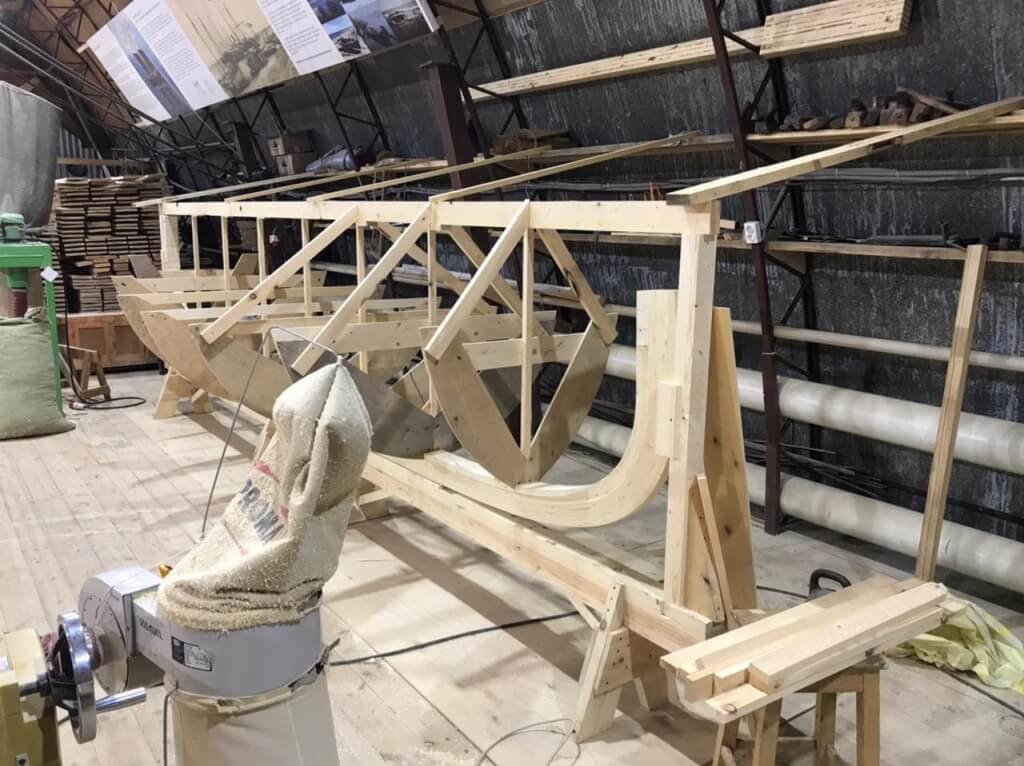 26 марта. Артём поставил стапель для сельдяного карбаса, установил на него закладку карбаса и начал монтировать на него шаблоны для обшивки.