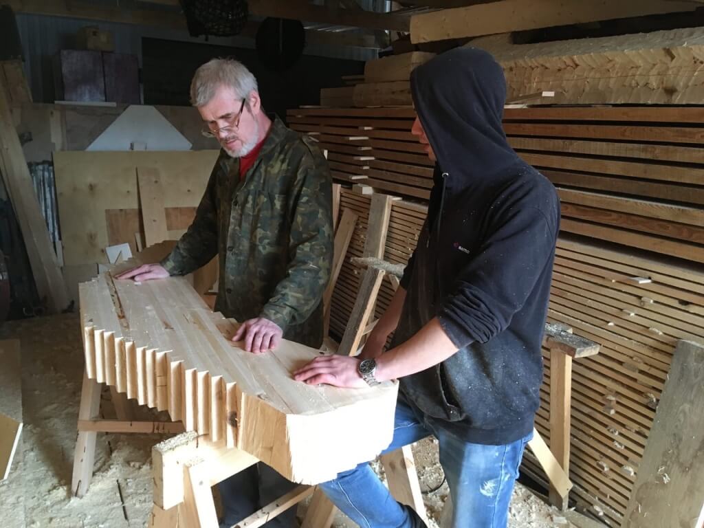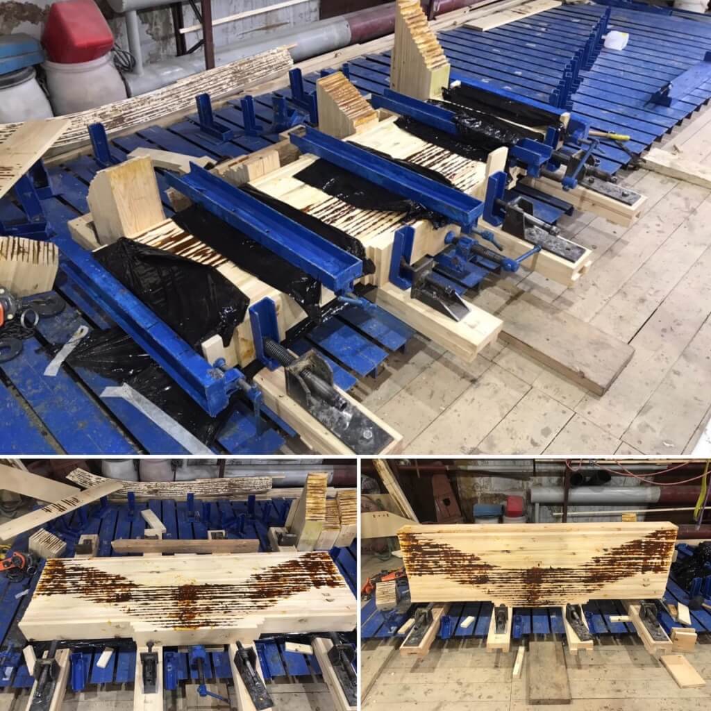 Артем делает шпангоуты. Иван, который здорово освоил обстрожку ветвей шпангоута, обстрагивает ветви – под руководством Игоря. Никита с ребятами варят из воронежских заготовок струбцины имени М.В. Крупенина. Несколько свеженьких, еще горячих струбцин уже готово. А еще мы освоили новую (третью по счету) технологию выклейки флора. Выглядит это чудно и прямоугольно, но когда завтра ребята его разневолят, то станет понятно, в чем был фокус. День хороший!