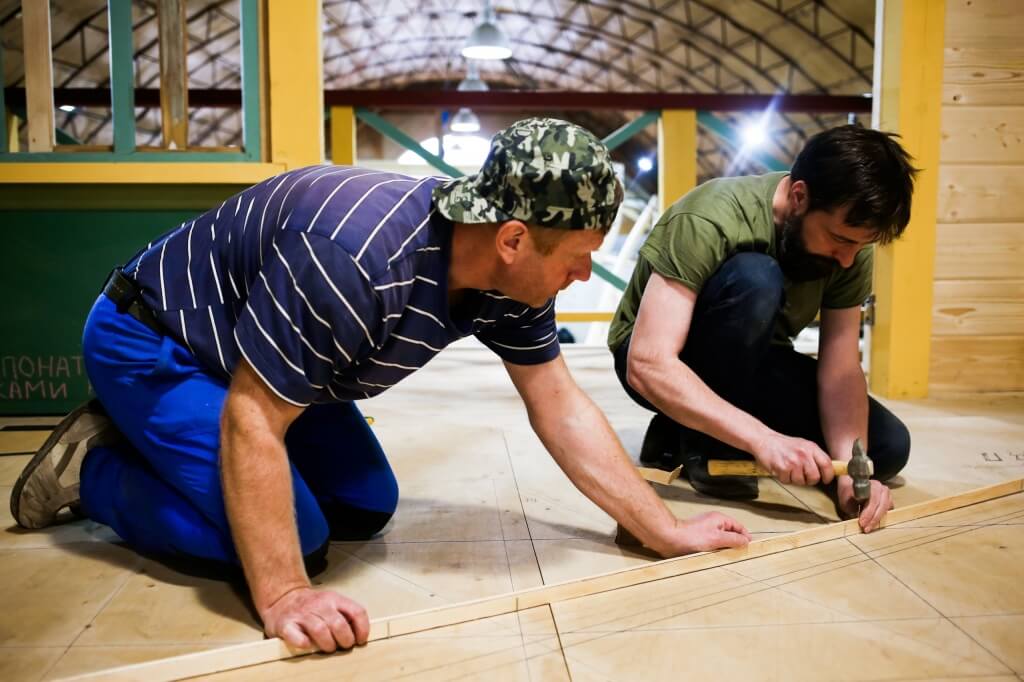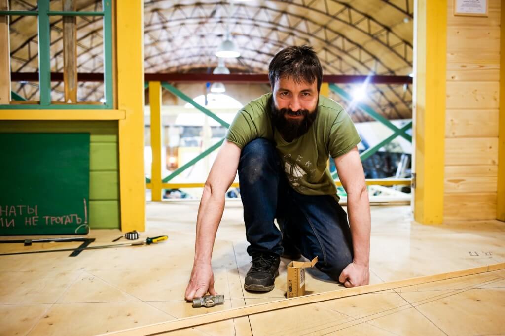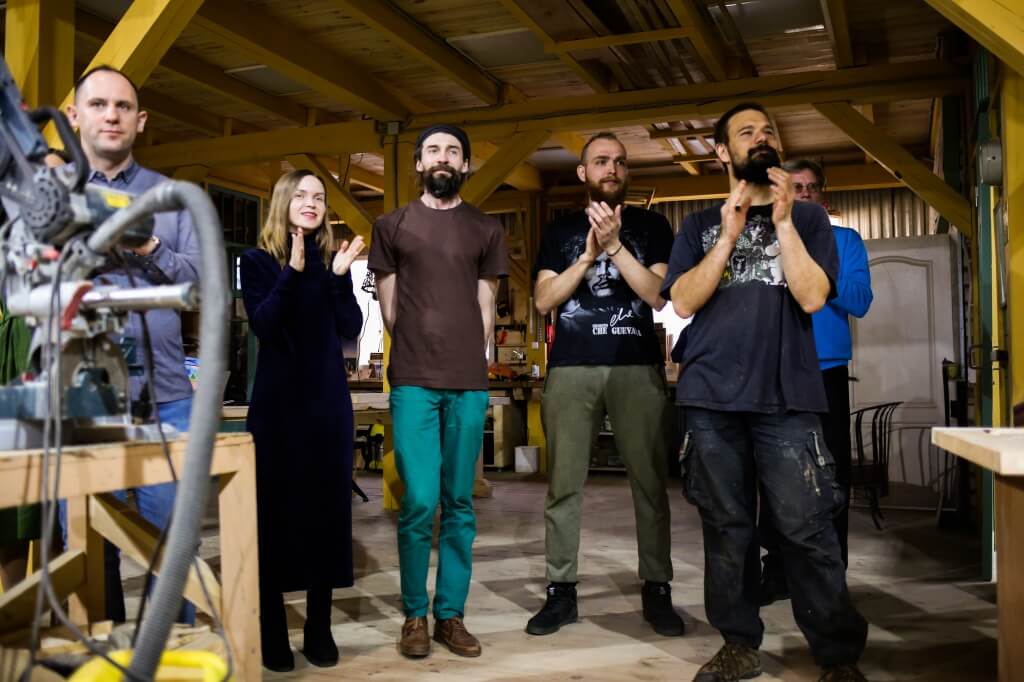 Гоша стеклит, Леня с Нестором пилят, Богдан чинит, Миша чертит.