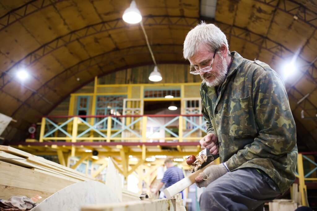 Егор Староверов вычиняет доски для шпангоутов шхуны.
