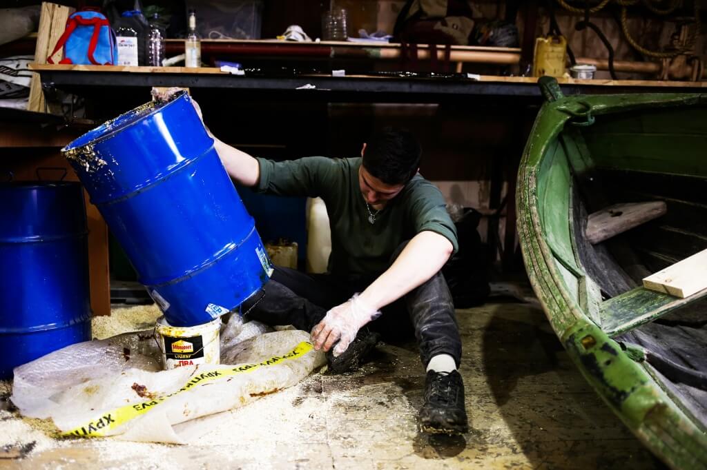 Артём занят вторым регатным карбасом, ставит первый, шпунтовый набой.